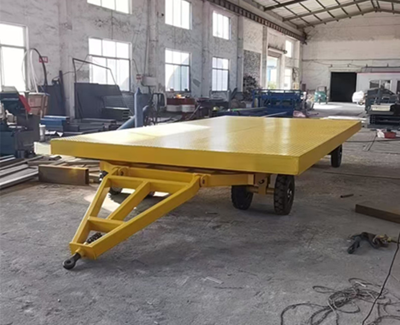 拖纜軌道行走平板車運行時時靠平車所拖地電纜供電。電纜的一端接在地面電源上,另一端經(jīng)電動平車的鐵夾裝置引入平車。該型電動平車的特點是臺面高度較低,裝卸重物容易,但運行距離不能太長,一般不能超過100m,過長容易纏繞電纜。